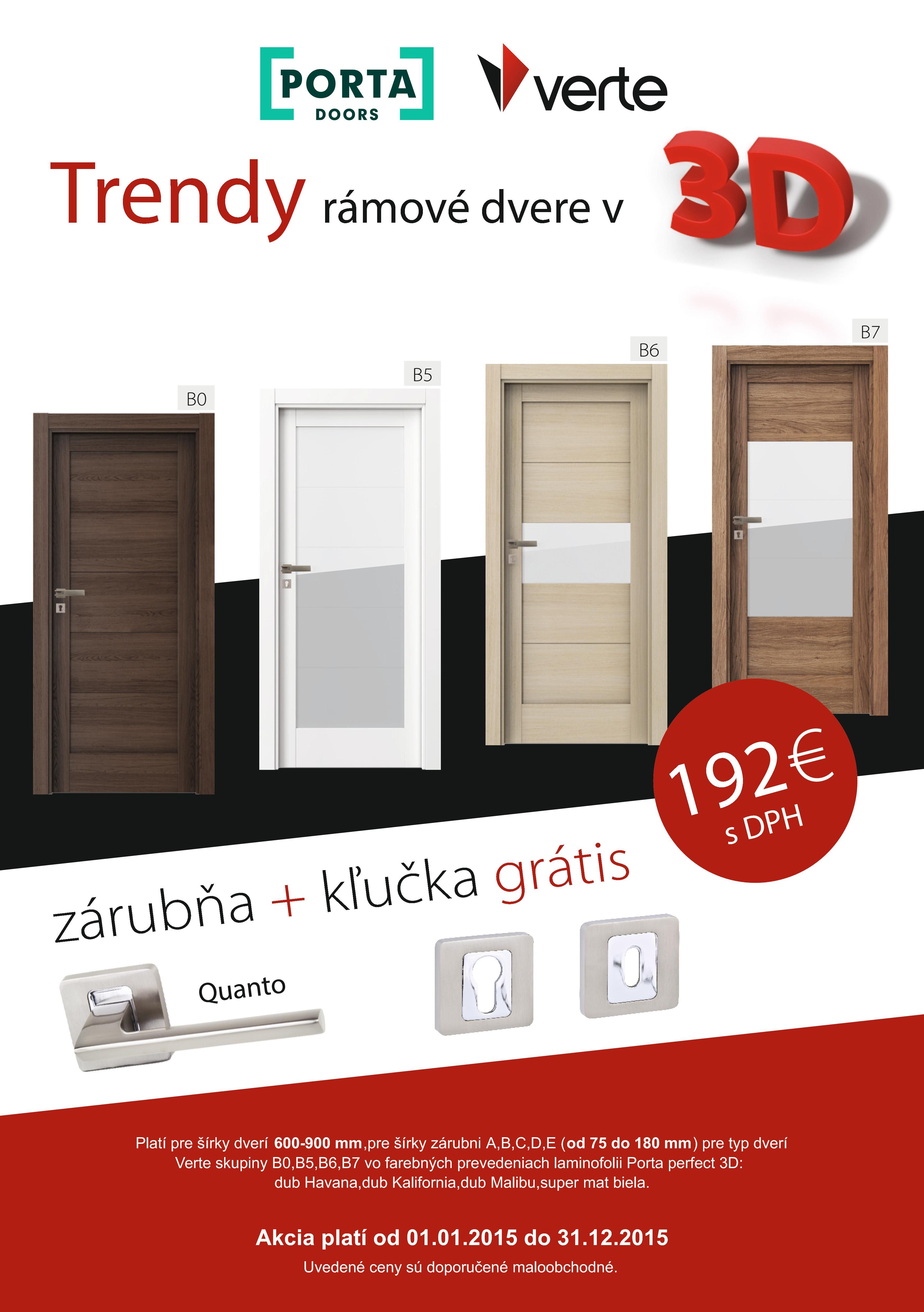 Interiérové dvere je možné kúpiť v rozmeroch krídel 60 - 100cm. Podľa STN sú tieto interiérové dvere falcové, vyrábané na 3 pánty. Svetlá výška otvoru dverí je 1980mm. Krídla dverí je možné podľa individuálnych potrieb skrátiť, maximálne o 60mm (krídla posuvných dverí sa skrátiť nedajú). Ku každému modelu dverí je v ponuke obložková zárubňa vyrábaná z drevitého materiálu – dosky MDF špičkovej kvality. Podobne ako povrchová úprava dverí, aj pri zárubni je možnosť fóliovej dyhy alebo prírodnej dyhy. Konštrukcia zárubne umožňuje jej použitie na steny hrubé 75 – 320mm a nastavovanie +20mm.